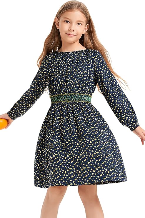 Girls Fall Long Sleeve Dress Formal Party Holiday Smocked Waist Midi Dresses 5-12Years
