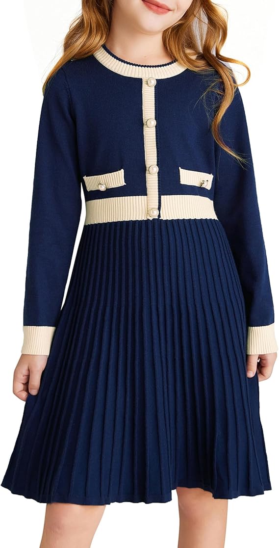 Girls Sweater Fall Dress Long Sleeve Knit A Line Contrast Casual Winter Dresses 5-12Y
