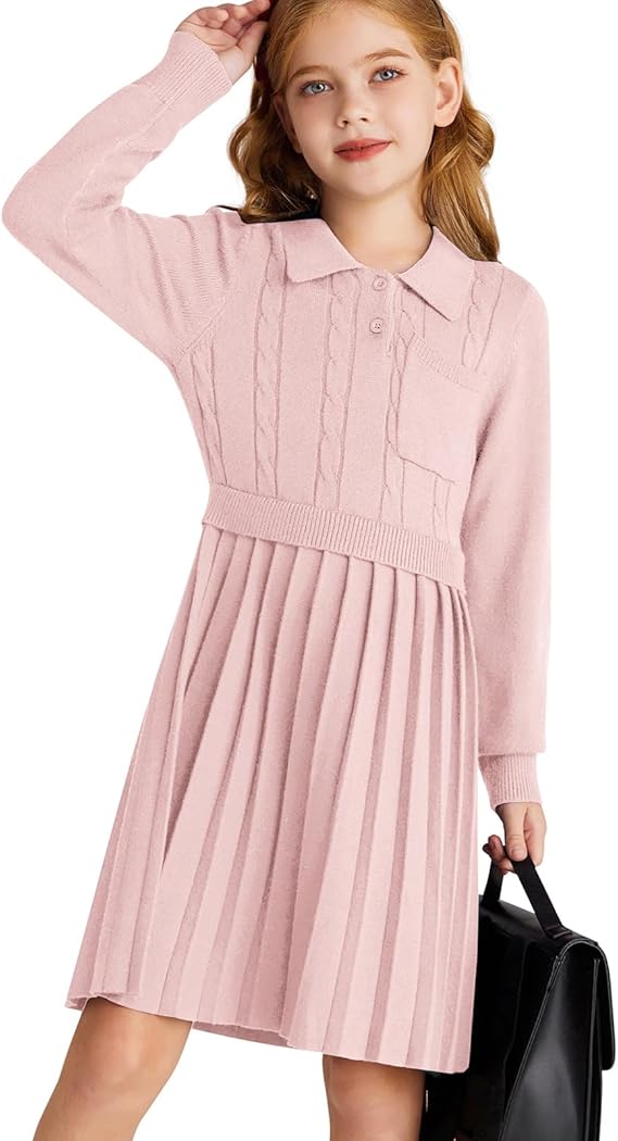 Girls Sweater Dresses Lapel Kids Long Sleeve Fall Winter Casual School Preppy Knit Pleated Dress for Girls 5-12