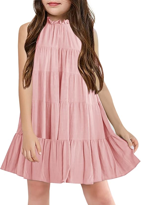 Girls Halter Neck Summer Dress Ruffle Tiered Swing Sleeveless Sundress Flowy A Line Mini Dresses for 5-14 Years