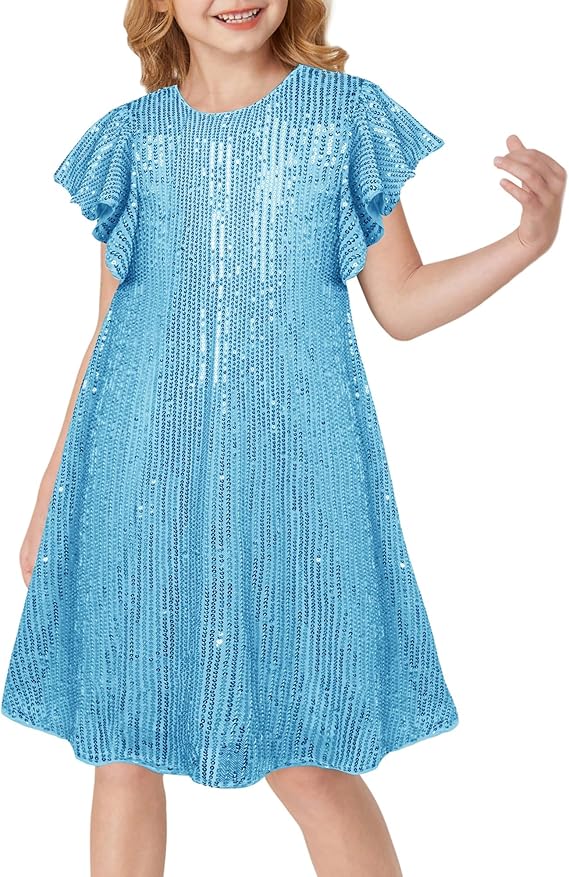 Girls Sequin Dress Short Flutter Sleeve Flare Silhouette Midi Dress with Hairbow 5-12Y