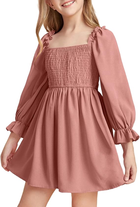 Girls Fall Long Sleeve Dress Formal Party Holiday Smocked Waist Midi Dresses 5-12Years