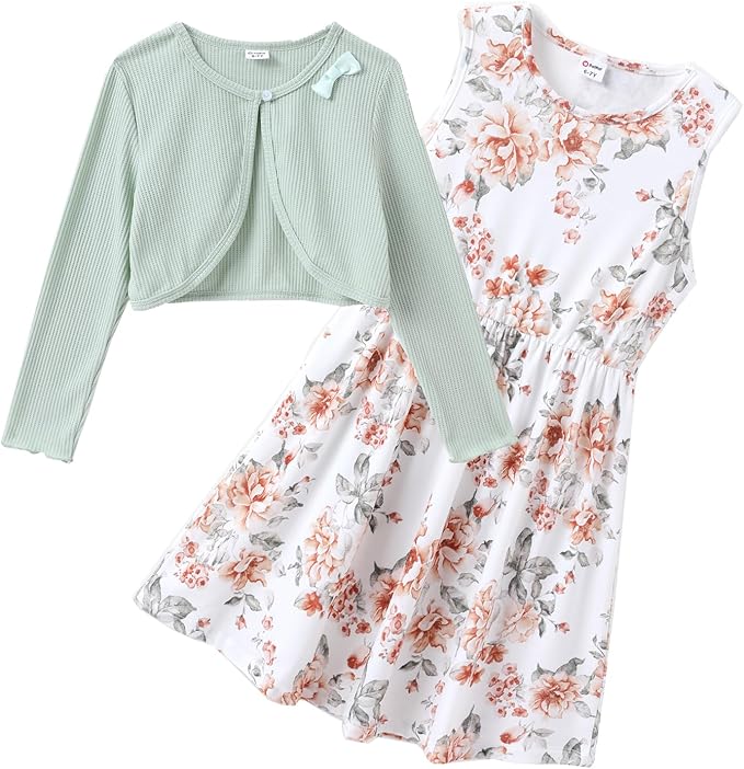 Girl Dress and Cardigan 2 Piece Girl Floral Print Sleeveless Tank Dress and Short-Sleeve Ruffle Cardigan Set